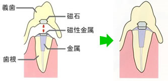 残っている歯がわずかな場合やぐらついた歯にワイヤーを引っ掛けなければならない時に磁石に変えることで歯への負担を減らします。