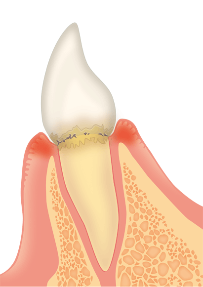 軽度な歯周病の患者さんの口腔内は、磨き残しの歯垢や歯石が付着して歯の周囲が汚れています。歯肉(歯茎)は赤くなり、口臭もしてきます。歯ブラシすると出血する人も出てきます。