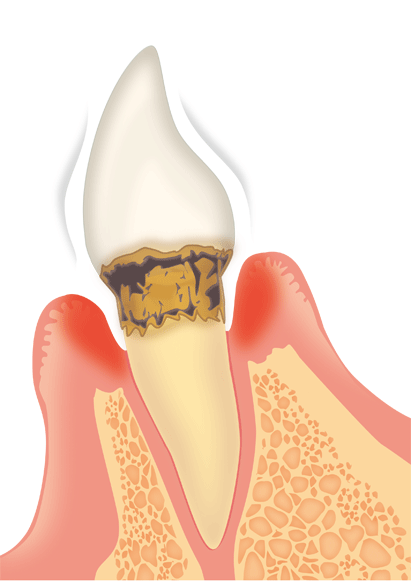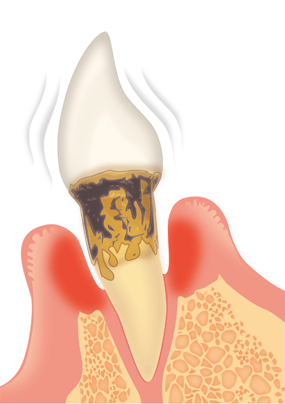 歯周病が進行して膿が出るくらいになると、あごの骨が破壊されるので歯自体もグラグラになってしまいます。やがて歯を失うことになります。